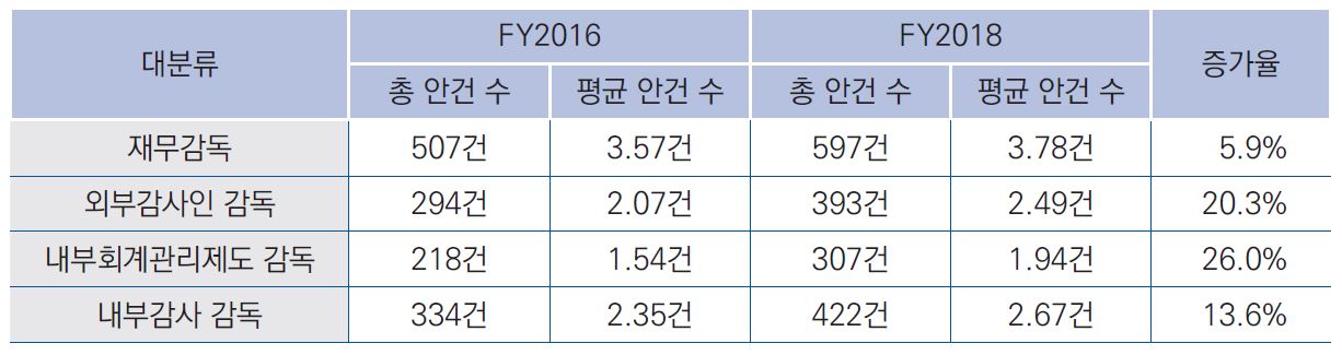 한편 국내 상장법인 중 내부회계관리제도에 대해 비적정 검토의견을 받은 기업의 비중은 2016년 1.5%, 2017년 2.0%, 2018년 2.9%로 매년 증가 추세를 보였다. 이는 내부회계관리제도 관련 법제도가 대폭 강화된 데 기인하는 것으로 분석됐다.