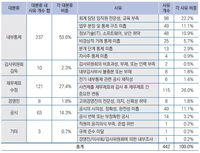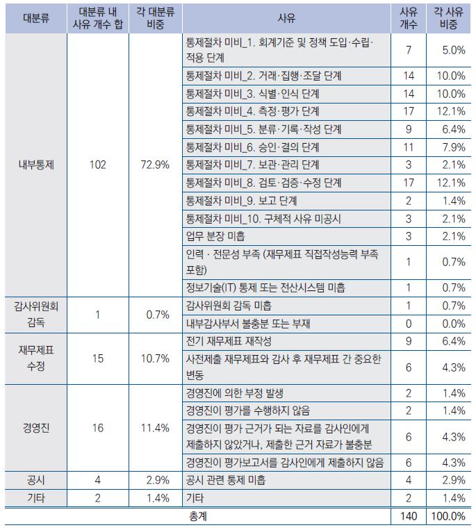 2018년 사업연도에 내부회계관리제도에 대해 비적정 의견을 받은 국내 상장법인 56사를 대상으로 비적정 사유를 조사분석한 결과 '통제절차 미비'가 가장 많은 사유(97개, 69.3%)로 나타났다. 비적정 사유를 받은 각 기업은 대개 복수의 사유를 갖고 있어 총 사유 개수는 총 140개에 달했다.