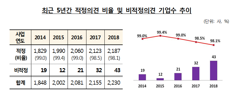 금융감독원은 지난 13일 2018회계연도 상장법인 2천230사의 감사보고서를 분석한 결과, 적정의견 비율은 98.1%로 전기 98.5% 대비 0.4%p 하락한 것으로 집계됐다고 밝혔다. 감사인 지정기업의 증가와 엄격한 감사환경 조성으로 인해 상장법인 적정비율이 지속 하락하고 있는 것으로 분석됐다.
