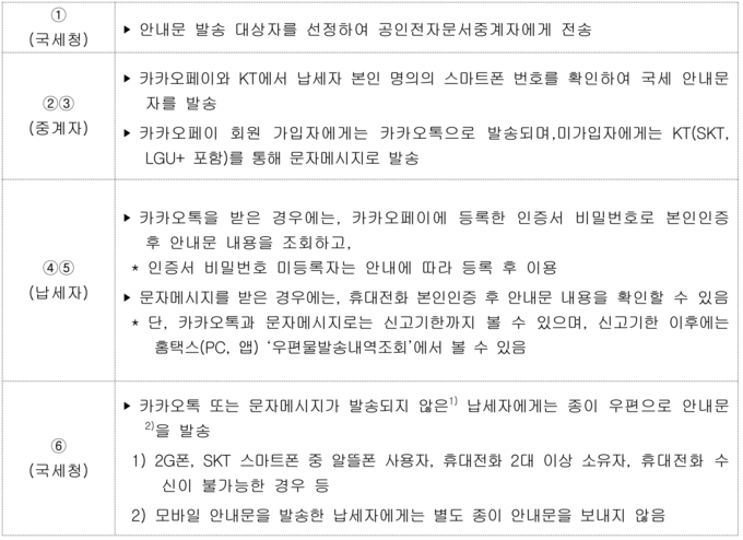 모바일 안내문은 공인전자문서 유통 사업자로 허가받은 카카오페이, KT(SKT, LGU+ 포함)를 통해 납세자 본인 명의의 휴대전화 번호로 발송된다. 카카오톡이나 문자메시지를 받은 납세자는 휴대번호 인증 등 간단한 본인인증절차를 거쳐 안내문 내용을 확인할 수 있다.