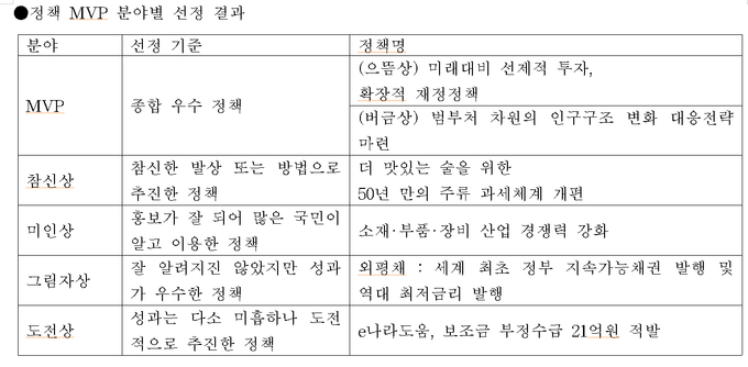 올해 ‘정책 MVP’는 총 34개의 후보 정책을 대상으로 5개 분야에서 6개의 우수 정책이 선정됐다.