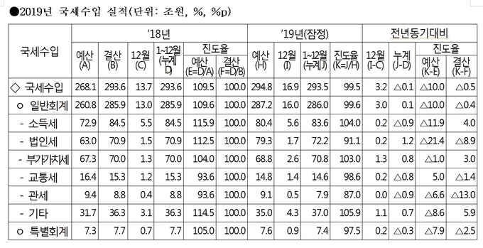 10일 월간 재정동향 2020년 2월호에 따르면, 지난해 국세수입실적은 293조5천억원으로 세수진도율은 99.5%를 기록했다.
