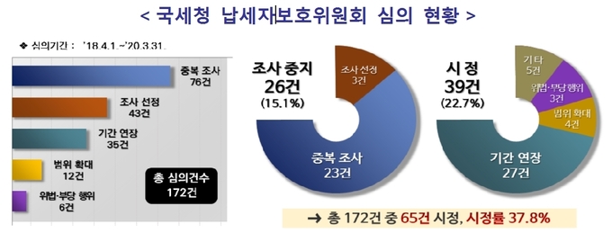 국세청 납보위는 172건 중 중복조사 등 위법·부당한 세무조사 26건을 중지 조치했다. 또 조사기간 연장이나 범위 확대에 문제가 있는 39건을 시정 조치했다. 172건 중 65건을 시정함으로써 38%의 시정률을 기록했다.