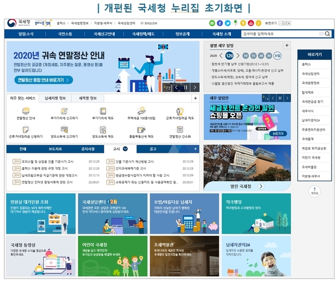 새로운 홈페이지는 ‘월별 세무일정’을 눈에 띄게 배치해 납세자와 세무대리인들이 세금신고 일정을 참고할 수 있도록 했고, 연말정산⋅부가세신고⋅법인세신고⋅사업자등록신청⋅주택세금100문100답 등 ‘자주 찾는 서비스’ 메뉴를 별도 구성해 편의성을 높였다.