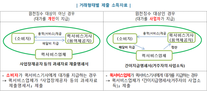 사업자가 아닌 개인(소비자)이 퀵서비스 기사 등 용역제공자에게 대가를 지급해 원천징수 대상이 아닌 경우에는 용역제공자에 관한 소득자료를 제출하면 된다. 즉 소비자가 퀵서비스기사에게 직접 배달비를 지급했다면 용역을 알선·중개한 퀵서비스업체는 용역제공자에 관한 소득자료인 ‘사업장제공자 등의 과세자료 제출명세서’를 제출해야 한다.