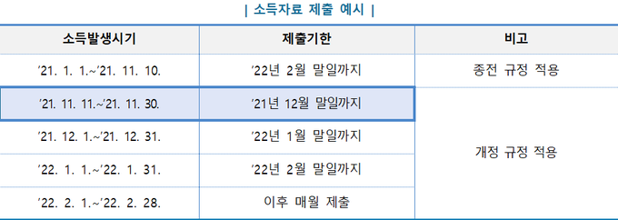 11월11일부터 30일까지 소득자료 ‘12월 말일까지’ 제출