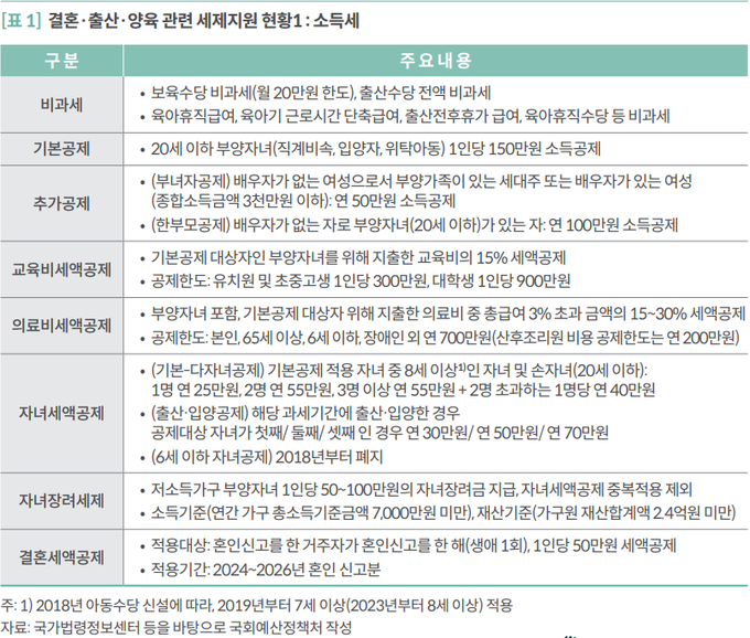 현재 우리나라 결혼·출산·양육과 관련한 세제지원은 주로 소득세를 중심으로 이뤄져, 보육수당 및 출산수당 등 비과세, 부양자녀에 대한 인적공제 등 소득공제, 교육비·의료비 세액공제 등이 대표적이다.