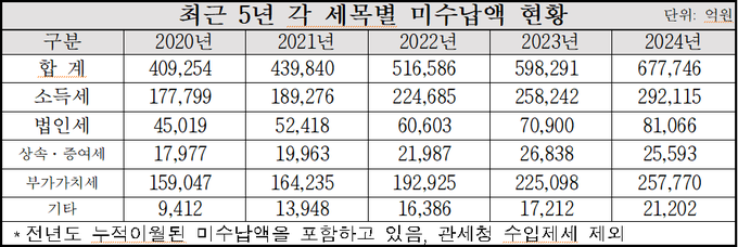 미수납액은 기한이 지났음에도 납부하지 못한 체납액과 기한이 남아있지만 납부하지 않은 세액을 포함한 금액이며, 최근 5년간 단 한 해도 줄어든 적이 없다.