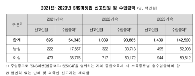 차규근 의원(조국혁신당)이 5일 국세청으로부터 받은 자료에 따르면, SNS마켓업 신고인원은 2021년 695명에서 2023년 1천439명으로 증가했다.