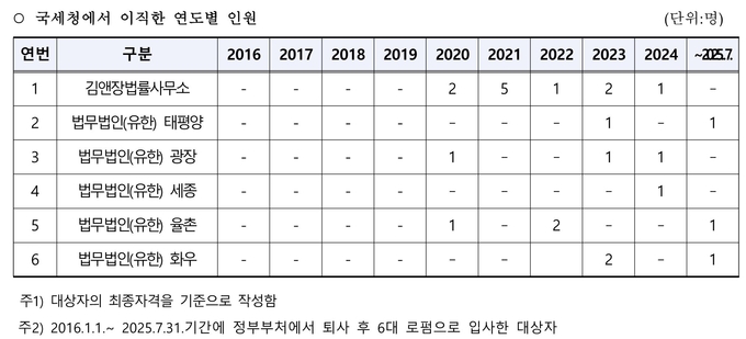 최은석 의원(국민의힘)이 10일 국민건강보험공단에서 받은 자료에 따르면, 2020년부터 올해 7월까지 국세청 퇴직자 중 대형로펌에 재취업한 사람은 24명이다.