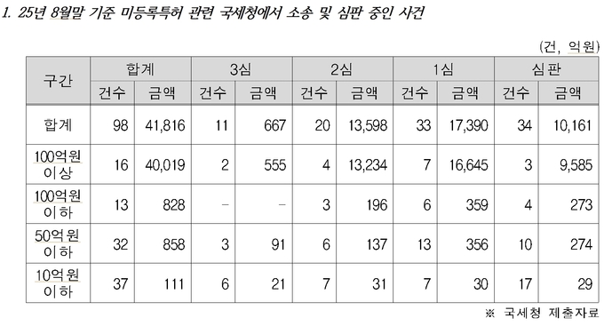 국세청이 제출한 자료에 따르면, 올해 8월말 기준 미등록특허 관련 소송은 ▷3심 11건(667억 원) ▷2심 20건(1조3천598억 원) ▷1심 33건(1조7천390억 원)이다. 조세심판원 단계 사건 34건(1조161억 원)까지 합친다면 전체 소송·심판 중인 분쟁 건은 98건, 소가·청구세액 규모가 4조1천816억 원에 이른다.