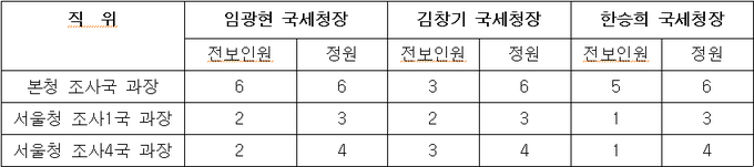 임광현 국세청장은 취임 직후 단행한 전보인사에서 서울청 조사1국 조사과장 3명 가운데 2명(66.7%), 조사4국은 4명 가운데 2명(50%)을 각각 교체했다.