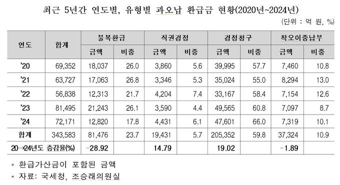 15일 조승래 의원(더불어민주당)이 국세청으로부터 제출받은 자료에 따르면, 최근 5년간(2020~2024년) 국세청의 과오납 환급금은 환급가산금을 포함해 총 34조3천583억 원으로 집계됐다.