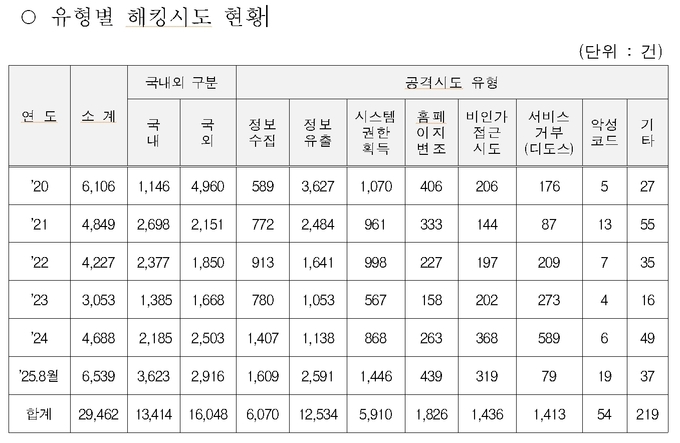 해킹 시도 유형을 보면, 정보유출 목적이 1만2천534건으로 42.5%를 차지했으며, 다음으로 정보수집 목적이 6천70건으로 많았다. 이어 시스템 권한 획득 5천910건, 홈페이지 변조 1천826건, 비인가 접근 시도 1천436건, 서비스 거부(디도스) 1천413건, 악성코드 54건, 기타 219건 순으로 나타났다.