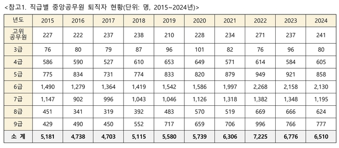 이 중 6급이 2천130명, 7급이 1천195명으로 51.1%를 차지했다. 6급 퇴직자는 2015년 1천490명애에서 2016년 1천279명으로 줄었다가 매년 꾸준히 증가해 2022년부터는 3년 연속 2천명을 넘었다. 7급 퇴직자 역시 2016년(902명)과 2017년(996명)을 제외하고는 최근 10년간 1천명대를 보이고 있다.