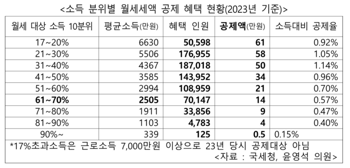 윤 의원이 2023년 소득 10분위별 월세세액공제 현황을 분석한 바에 따르면, 소득 수준이 낮아질수록 혜택인원과 금액이 줄어드는 '소득 역진적'으로 나타났다.