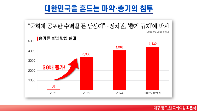 최은석 의원(국민의힘)은 21일, 지난 2021년 86건에 불과하던 총기류 적발 건수가 2022년 3천363건으로 39배나 증가했고, 2025년 상반기에는 이미 4천430건이 적발되는 등 불과 5년 만에 국내 총기 반입 적발 건수가 50배 가까이 폭증했음을 지목했다.