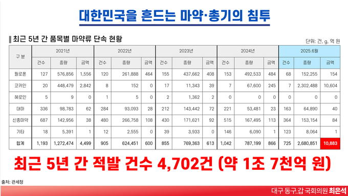 마약류 반입 상황은 더욱 심각해, 필로폰·코카인·헤로인·신종마약 등 최근 5년간 적발 건수만 4천720건, 시가로는 1조 7천억 원을 넘어섰다.