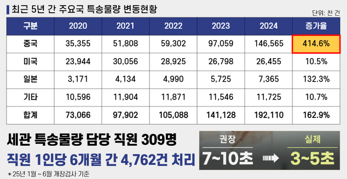 2020년 7천300만 건 수준이던 특송화물은 2024년 1억 9천200만 건으로 2.6배 급증했고, 중국발 물량은 같은 기간 414.6% 폭증했다.