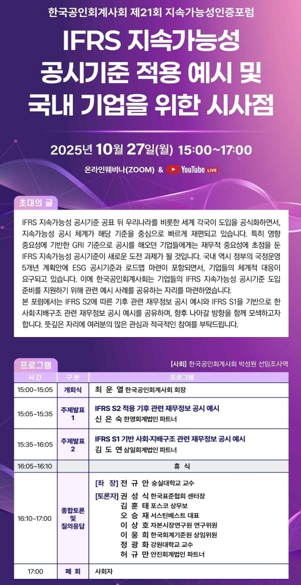 신은숙 한영회계법인 파트너와 김도연 삼일회계법인 파트너가 주제 발표를 맡아, 각각 IFRS S2 적용 기후 관련 재무정보 공시 예시와 IFRS S1 기반 사회·지배구조 관련 재무정보 공시 예시에 대해 발표한다.
