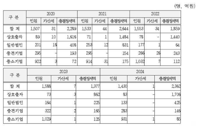 연도별로 보면, 2020년 2천289억원(1천507명), 2021년 2천644억원(1천533명), 2022년 1천859억원(1천553명), 2023년 1천377억원(1천588명), 2024년 2천362억원(1천430명)이다. 총 결정세액은 2021년 이후 계속 감소하다 작년에 다시 증가했다.