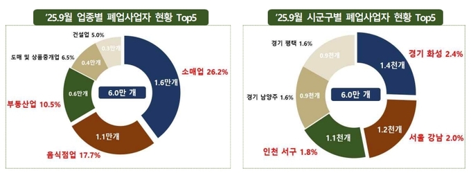 9월 기준 업종별 폐업사업자는 소매업 1만6천개, 음식점업 1만1천개, 부동산업 6천개, 도매 및 상품중개업 4천개, 건설업 3천개 순이다. 전월 대비 폐업사업자 증가가 높은 지역은 서울 강남구(264개), 서울 영등포구(237개), 인천 서구(190개), 경기 화성시(171개), 경기 평택시(147개) 순으로 나타났다.