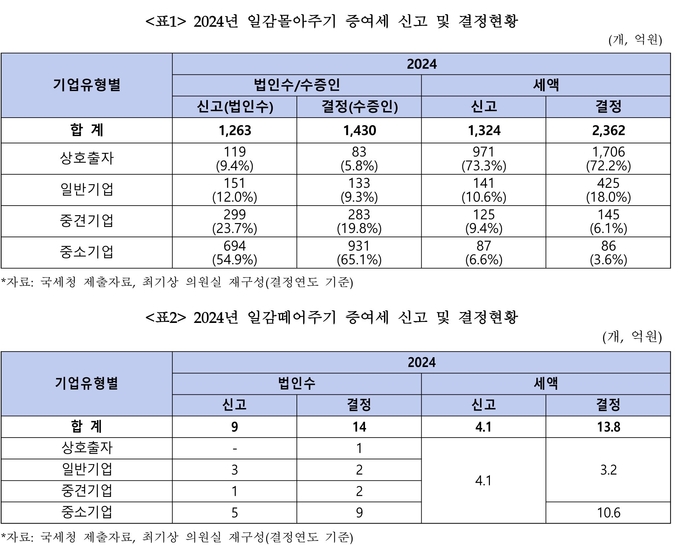 최기상 의원(더불어민주당)이 5일 국세청으로부터 제출받은 자료에 따르면, 2024년 기업들의 일감몰아주기 증여세는 2천362억원(1천430명), 일감떼어주기 증여세는 13억8천만원(14개 법인)이 부과됐다.