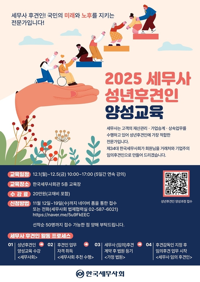세무사회는 중소기업·소상공인과 일상을 같이하면서 상속, 증여 및 가업승계 등 재산관리까지 책임지고 있는 세무사의 특성에 착안해 ‘임의후견인’ 육성 시스템과 조직을 갖추고 다음달 1~5일까지 ‘세무사 성년후견인 양성교육’을 실시한다고 11일 밝혔다.