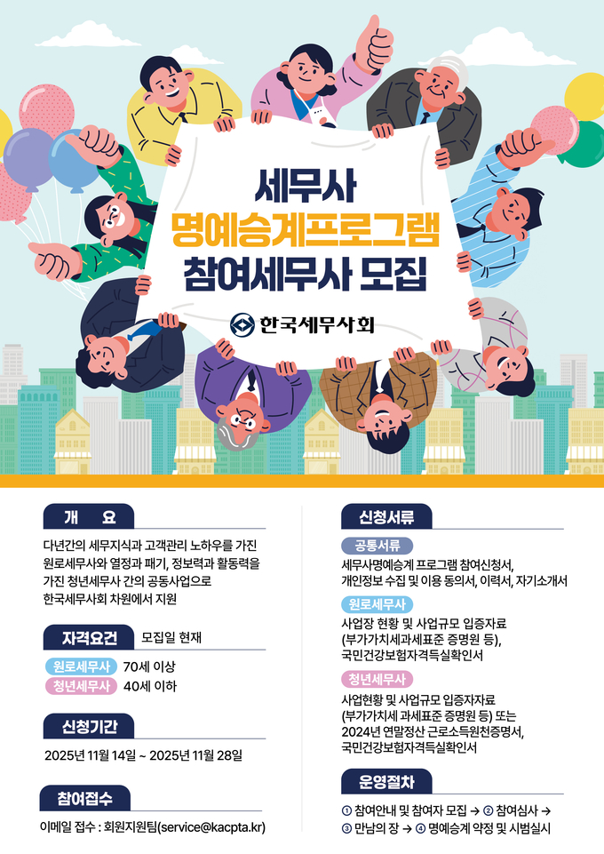 ‘세무사 명예승계 프로그램’ 신청 기간은 이달 14~28일이며, 세무사회가 제공하는 소정서식과 구비서류를 이메일(service@kacpta.kr)로 제출하면 된다.