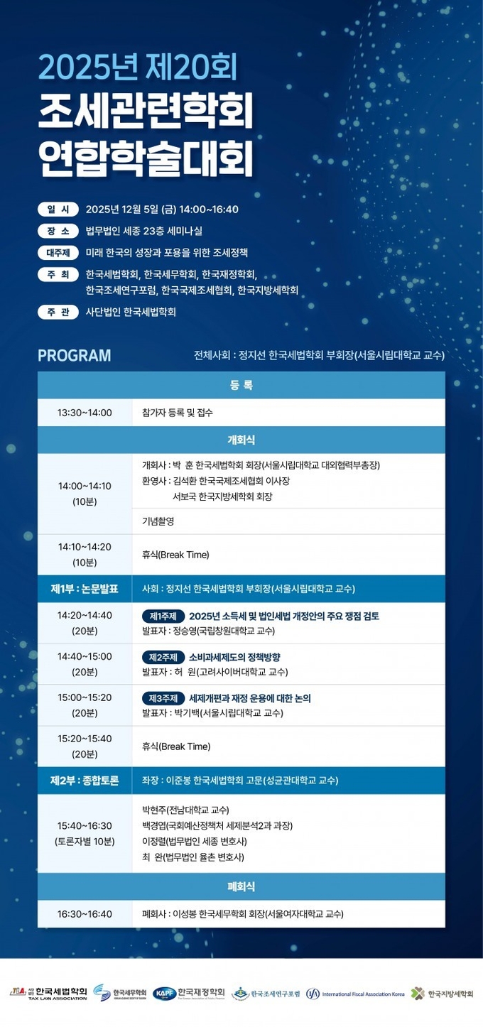 올해 연합학술대회는 법무법인 세종 23층 세미나실에서 '미래 한국의 성장과 포용을 위한 조세정책'을 대주제로 열린다.