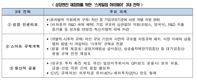 성장 인센티브에는 자산 등 기업규모기준에 따른 차별 지원을 완화하고, R&D 세제 혜택을 기업 규모와 상관없이 지원하는 등 R&D 지출 증가율 등 성과를 반영한 혁신지향적 세제를 마련하는 내용이다.