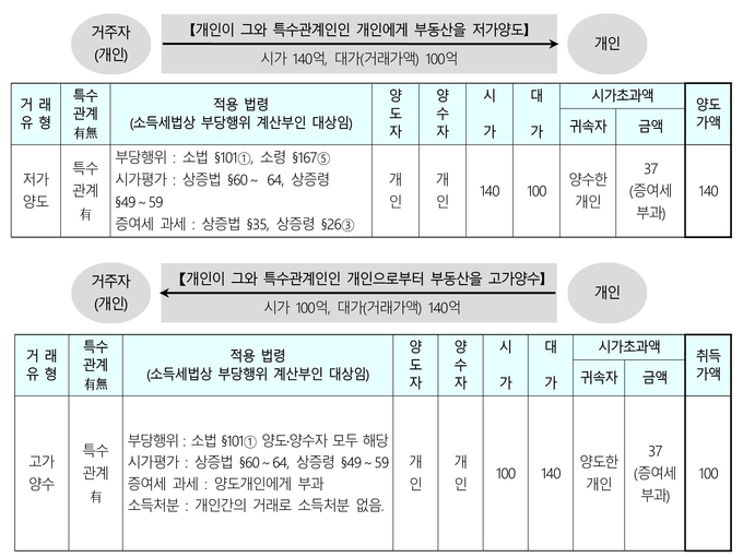 6) 또한, 친인척 등 국세기본법 시행령 제1조의 2 규정에 따른 특수관계인 사이에 부동산 등을 시가보다 낮게 저가양도(매수자는 저가양수) 하거나 시가보다 높게 고가양수(매도자는 고가양도)함으로써 시가와 대가의 차이액이 3억원 또는 차이율이 5%[=5%≧{(시가)-(대가)}÷(시가)] 이상에 해당되는 때에는 소득세법 제101조 제1항과 같은 법 시행령 제167조에 따라 저가양도자에게 양도당시 시가를 양도가액으로 적용하여 양도소득세를 추징하고, 고가양수자가 나중에 양도할 때의 취득가액은 취득당시 시가를 적용하여 양도소득세를 추징한다.