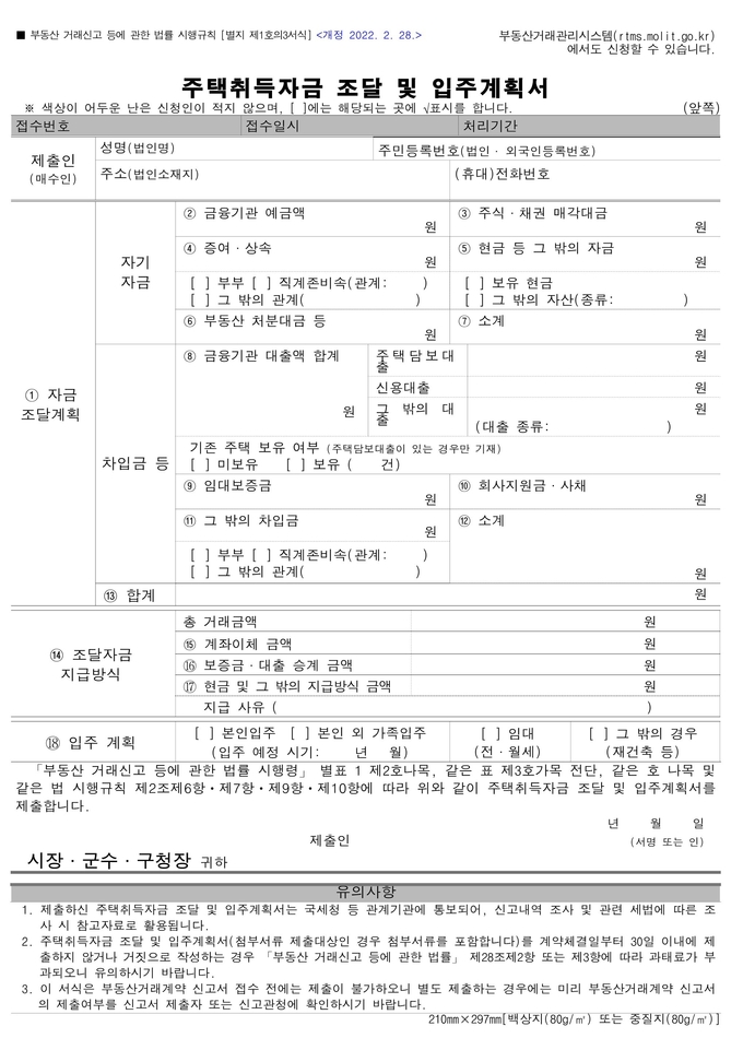 따라서, ‘주택취득자금 조달 및 입주계획서’의 신고·기재할 항목별 각각의 내용에 대하여 살펴보면, 아래 1)~8)을 중복하여 작성할 경우 허위기재로 과태료 부과되지 않도록 특히 주의하고,