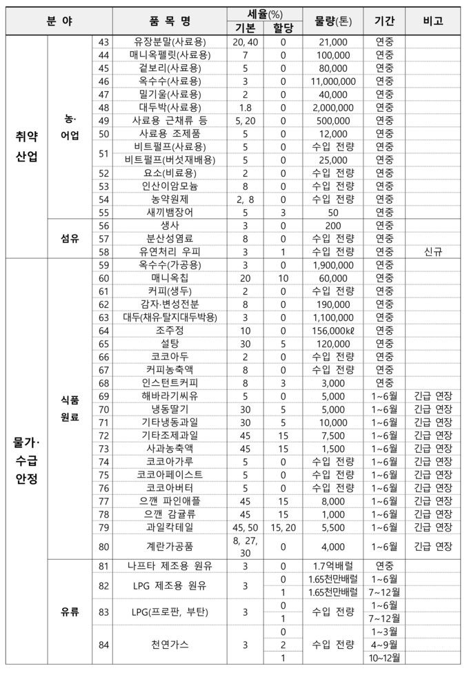 현재 긴급 할당관세로 지원하고 있는 해바라기씨유, 냉동딸기, 코코아가루 등 12개 먹거리 관련 품목에 대한 할당관세는 6개월 추가 연장한다.
