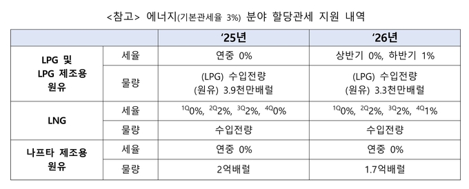우선 주택 난방용으로 주로 사용하는 액화천연가스(LNG), 액화석유가스(LPG), LPG 제조용 원유에 대한 관세율을 낮춘다. LNG는 내년 1분기 0%, 2~3분기 2%, 4분기 1%가 적용된다. 액화석유가스(LPG), LPG 제조용 원유는 내년 상반기 0%, 하반기 1% 적용한다.