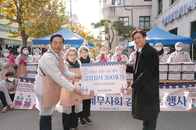 한국세무사회(회장·구재이)는 연말을 맞아 지난 2일 회관 앞마당에서 ‘2025 사랑의 김장 나눔’ 행사를 열고, 직접 담근 김장김치 300포기를 서초구 푸드뱅크마켓센터에 전달했다.