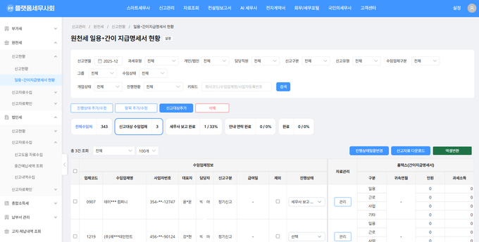 원천세 메뉴의 ‘신고현황’은 홈택스에서 원천세 신고자료를 자동 수집해 수임업체별 신고 완료 여부와 신고내역을 한눈에 관리하고, 홈택스에서 일용·간이지급명세서를 자동 수집해 전체 현황을 한 번에 검토할 수 있어 인건비 관련 신고리스크를 대폭 줄여준다.