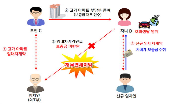해당 아파트의 기존 임차인은 자녀 D의 특수관계인(외조부)으로, 임대차계약 만료 후 전출한 것으로 확인되나, 보증금 반환 내역은 불분명하며, 자녀 D가 새로운 임차인으로부터 수취한 고액의 보증금은 해외주식·골드바 등 투자자산 취득 및 명품구입 등 사치 생활자금으로 사용한 것으로 드러났다.