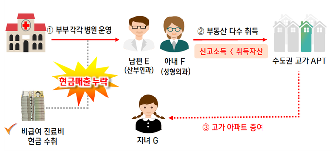 -E는 산부인과 의사이며, 배우자인 F는 성형외과 의사로 고가 부동산을 다수 취득하여 보유 중, 자녀 G에게 1채를 증여하며 증여세 O억원을 신고했다.