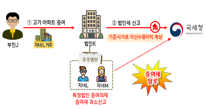 -부친 J는 서울 ○○동 소재의 고가 아파트를 자녀 L, M이 주주인 가족법인 K(부동산임대업)에 증여했으며, 법인세 신고 시 기준시가로 자산수증이익을 계상했다.