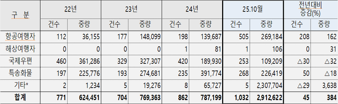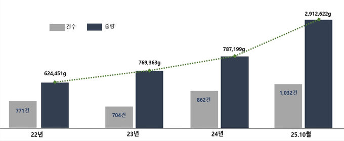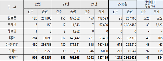 관세청에 따르면, 올해 10월말 기준 총 1천32건, 2천913kg의 마약을 국경단계에서 적발했다. 이는 전년 동기 대비 적발건수는 45%, 중량은 384% 증가한 수치로 중량 기준으로는 역대 최대 적발량을 기록했다.
