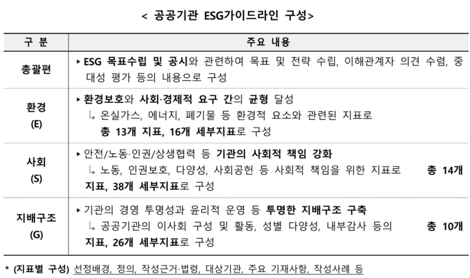 기재부는 "기존의 알리오 및 법정 공시자료를 최대한 활용하면서, 특히 기관별 역량·편차를 고려해 각 지표를 필수지표와 자율지표로 구분함과 동시에 작성사례도 함께 제시하는 등 공공기관의 ESG 경영보고서 작성을 위한 실무지침서 역할을 하도록 구성했다"고 밝혔다.