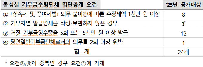 공개된 불성실 기부금수령단체 24곳은 실제 기부금 수령액보다 많은 금액으로 거짓 기부금영수증을 발급했거나, 출연자 또는 그의 특수관계인을 임·직원으로 고용하는 등 상증세법 위반으로 1천만원 이상 세액을 추징당한 단체가 공개 대상이다.