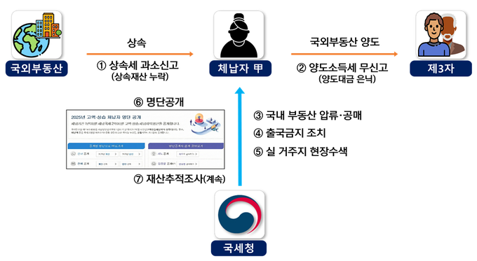 국세청은 체납자의 국내 부동산(00억원)을 압류해 공매의뢰했으며, 국외재산 보유 등 출국금지 요건에 해당해 출국금지하고, 재산추적조사 대상으로 선정해 실거주지 현장수색했으며, 명단공개 요건에 해당됨에 따라 올해 고액·상습체납자로 명단을 공개했다.