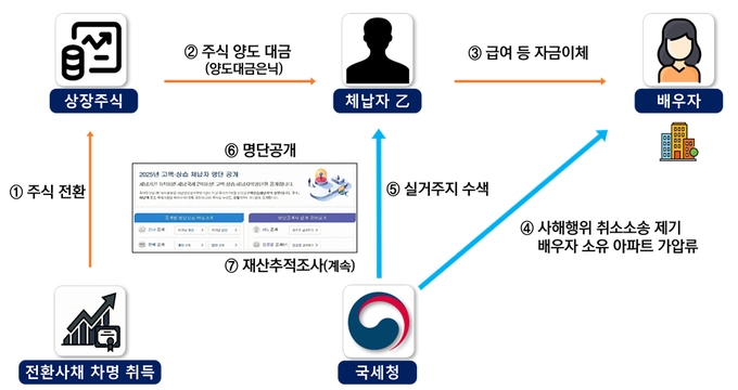 국세청은 체납자의 급여를 배우자에게 이체해 은닉한 사실을 확인하고, 배우자를 상대로 사해행위취소소송을 제기했다. 또한 배우자 소유의 아파트를 가압류했으며, 체납자의 실거주지를 수색해 고급 주류 24점을 압류하는 한편, 올해 고액·상습체납자로 명단을 공개했다.