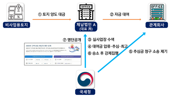 국세청은 A법인이 부동산 양도대금을 수령한 직후 관계회사에 지급한 내역을 확인하고 실사업장을 수색해 장부를 징취한 결과 대여금인 것을 확인했다. 또한 관계회사에 대여금 채권압류 및 추심 최고했으나, 추심요구에 응하지 않아 추심금 청구소송 제기 및 승소했으며 올해 고액·상습체납자로 명단공개을 공개했다.