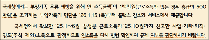 매번 신고하는 부양가족 공제, 잘 신고했는지 한 번 더 확인해야 한다. 인적공제 대상으로 신고한 (조)부모님, 자녀(손자녀 포함), 또는 생계를 같이 하는 형제자매의 2025년 소득금액이 1백만원(근로소득만 있는 경우 총급여 500만 원)을 초과하는 경우 공제대상에서 제외해야 한다.