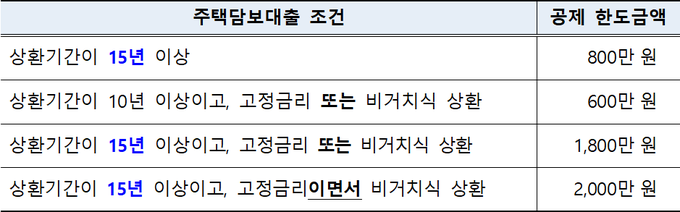 또한 주택담보대출은 상환기간, 고정·변동금리, 거치식·비거치식 상환 방법에 따라 공제 한도가 다르므로 대출 시 꼼꼼히 확인해야 한다.