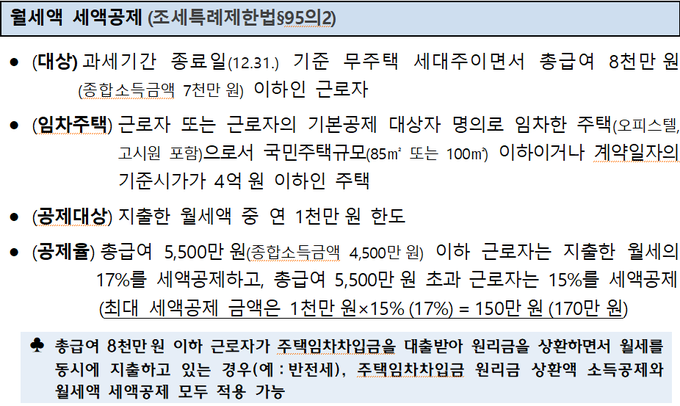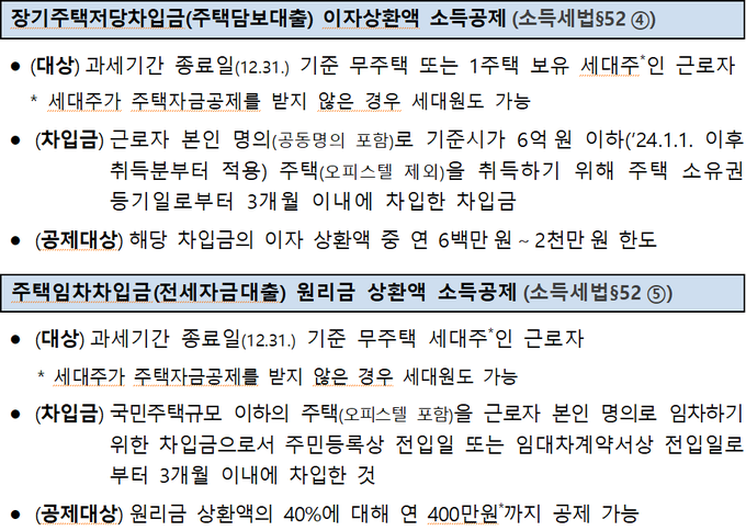 전세자금대출과 월세는 연도 중 주택을 보유하던 세대가 이를 매도해 연도말(2025.12.31.) 기준 무주택 세대이면 공제가 가능하나, 월세는 총급여가 8천만원(종합소득금액 7천만원) 이하인 근로자만 공제받을 수 있다.