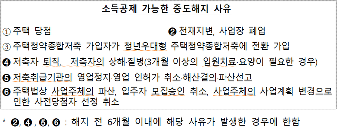 - 주택청약저축을 해지한 경우 해지연도의 납입액은 공제를 받을 수 없다. 다만, 주택 당첨 등 중도해지사유로 인한 해지 시에는 소득공제가 가능하다.